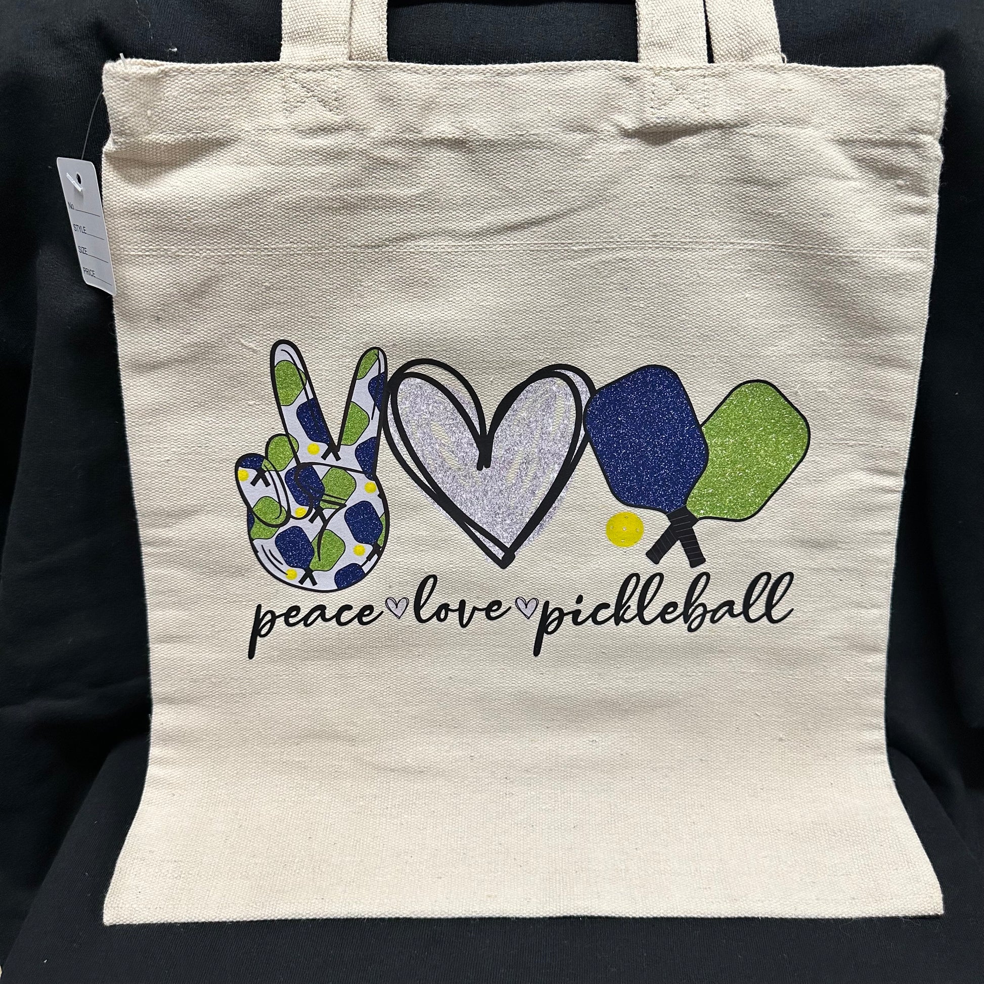 This durable canvas tote bag is the perfect accessory for a pickleball enthusiast. It measures 13" x 15" x .5" and is made of sturdy canvas material. With the words "Peace", "Love", and "Pickleball" prominently displayed, it's perfect for showing off your sport of choice.