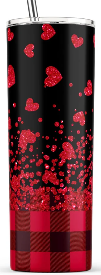 Hearts on Black. Each tumbler comes with a stainless-steel straw, a straw cleaner, and a food grade silicone tip for the straw if one chooses to use it.