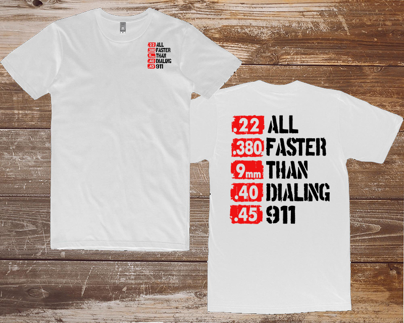 Stay safe with the "All Faster Than Dialing 911" t-shirt. This comfortable t-shirt is made from stretchy and breathable cotton fabric, offering optimal comfort and unrestricted movement. With its unique slogan and vibrant colors, it's a stand-out apparel choice to add to your wardrobe.