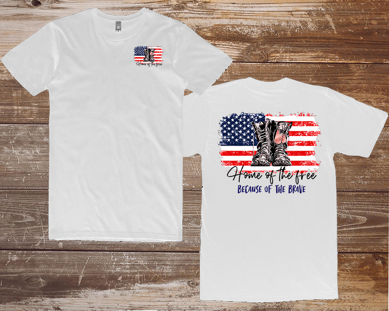 Show your support for our brave warriors with this T-shirt, featuring a print of the slogan "Home of the Free, Because of the Brave". Made from soft and comfortable fabric, this T-shirt is the perfect way to demonstrate your respect and appreciation for the struggles and sacrifices made by service members.