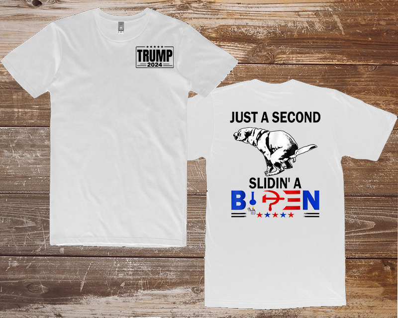 Show your political support with this T-Shirt featuring the slogan "Trump 2024 - Just a Sec, Slidin' a Biden"! Constructed from a cotton blend, this shirt offers maximum comfort and durability in a stylish design. Perfect for expressing your support for your favorite candidate!